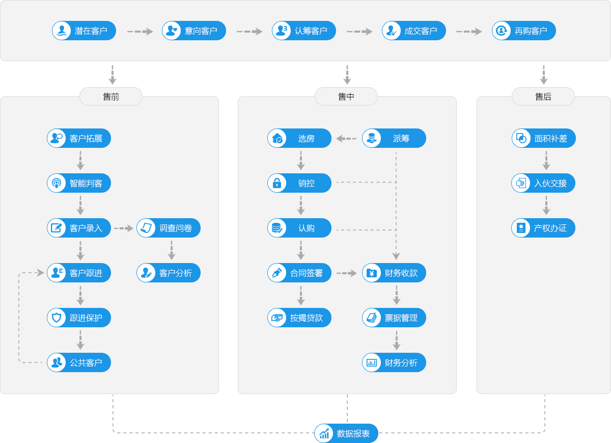 售后管理 對售后的客戶服務工作進行管理。包括按揭貸款、公積金貸款、入伙服務、產權服務、面積補差等。通過流程化的處理,提升客戶滿意度。