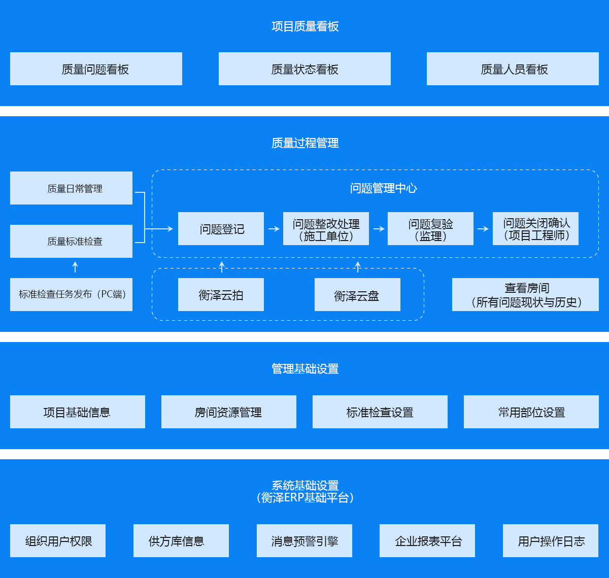 《衡澤ERP-工程管理系列》產品線通過領先的移動互聯網技術,讓地產工程建造環節的各類業務場景在線化,支持土建、初裝、精裝修等項目各階段的移動計劃管理、移動質量檢查。